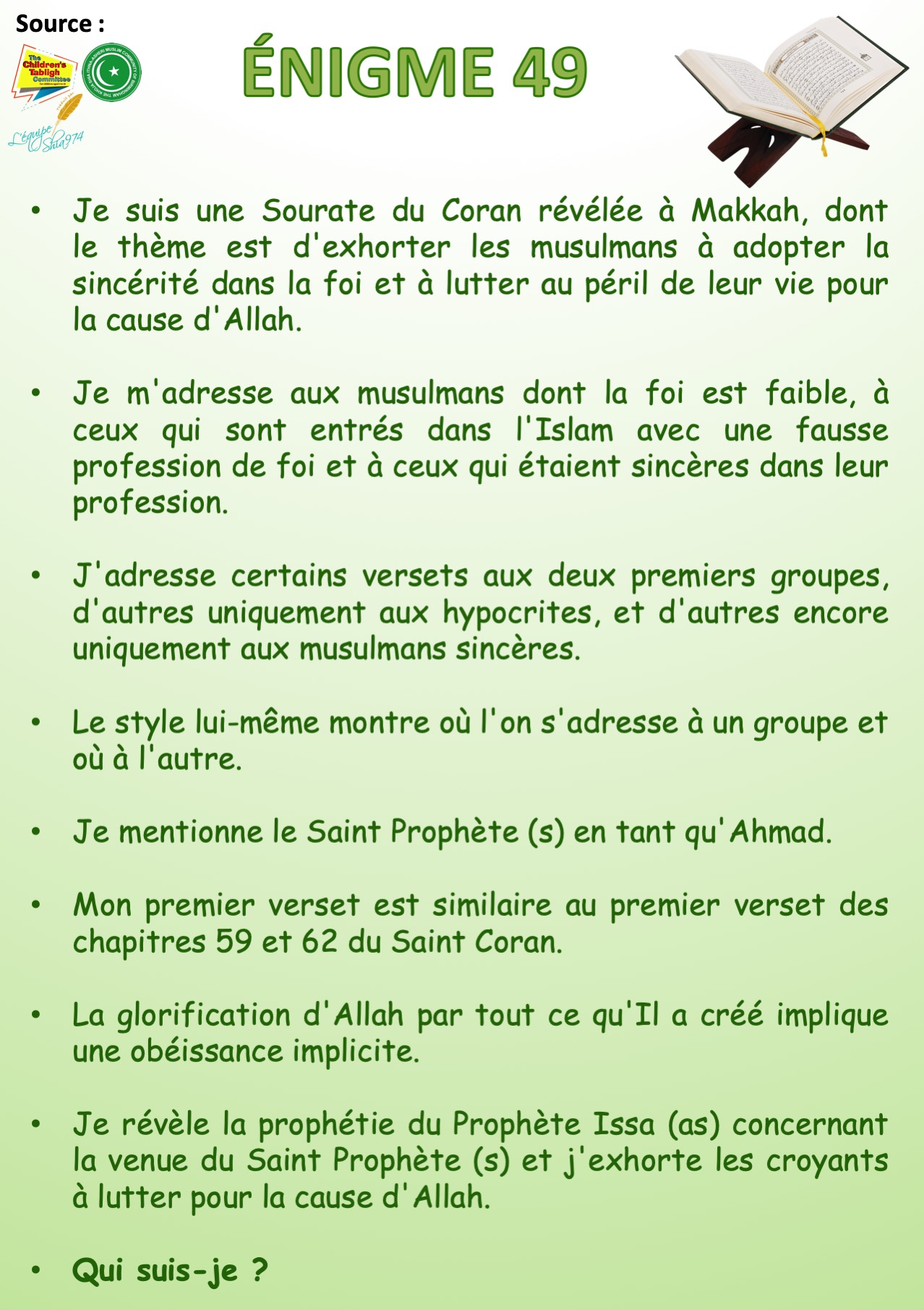 Enigme sur les Sourates du Saint Qour’an n° 49